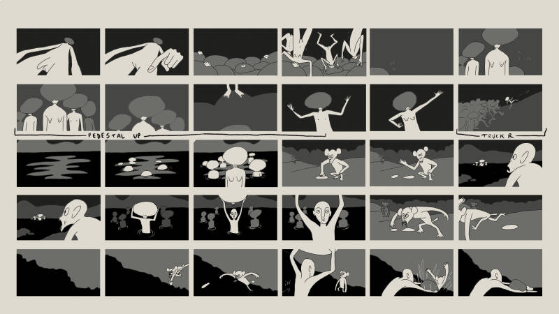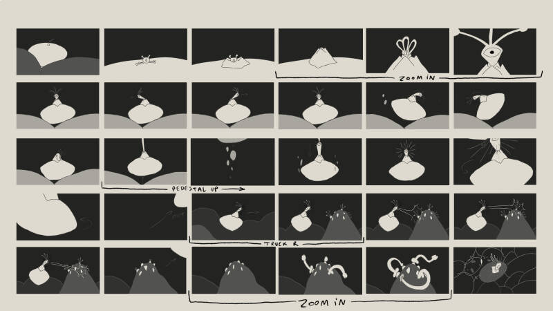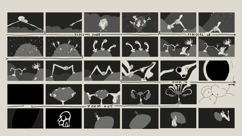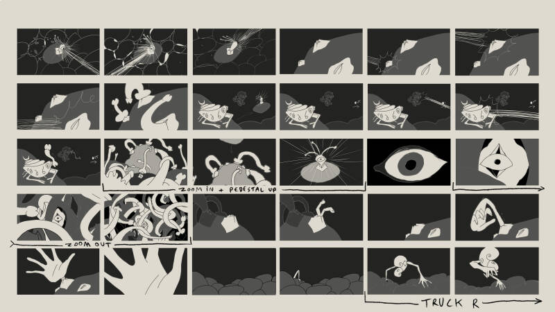The storyboards below are from my short-film 'Pok'. For this project I started directly with the making of the animatic because everything had to be on rhythm with the music, and also because it is a very abstract project so it was better for me to fully focus on visual storytelling instead of writing down a script.